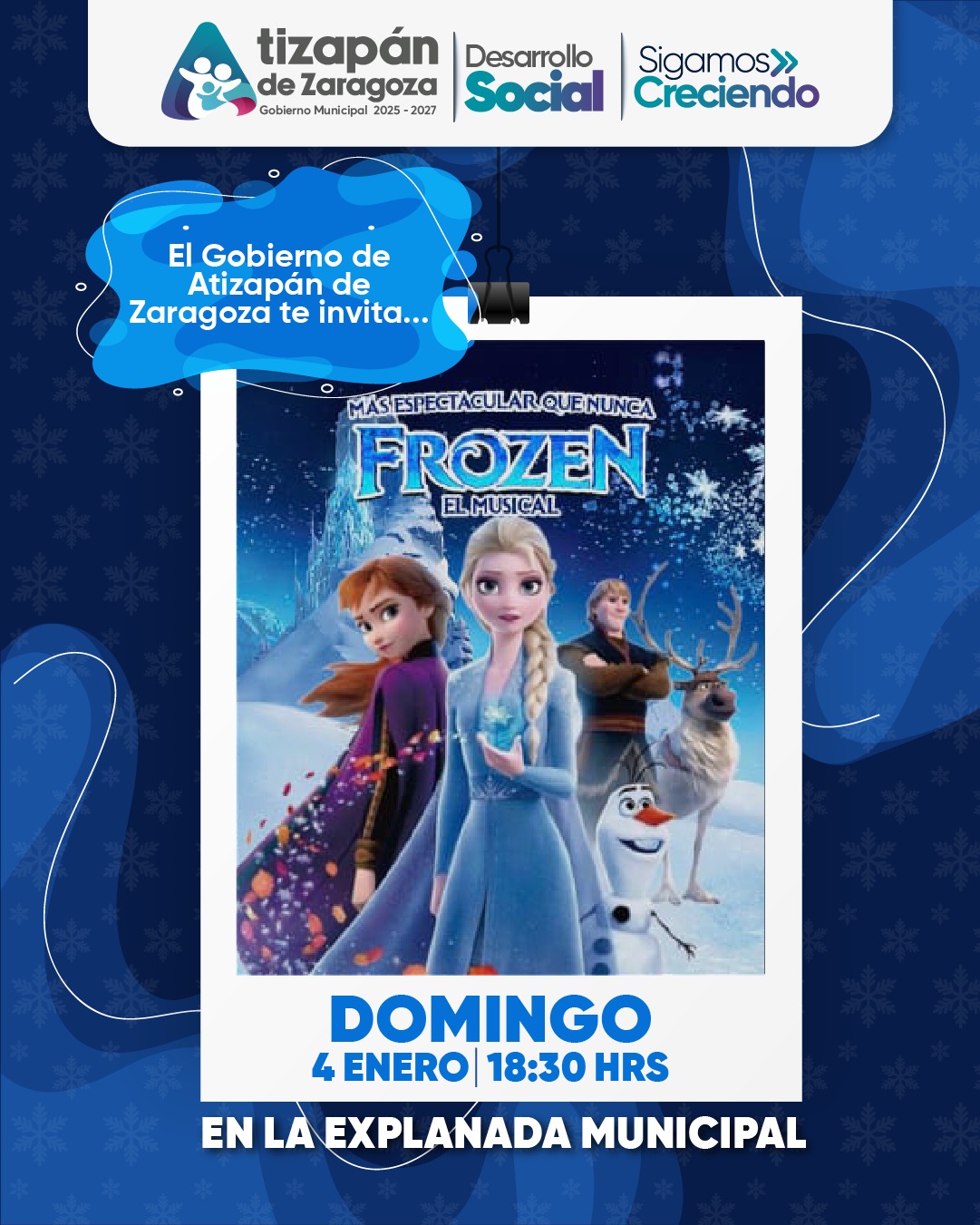 Mientras que el domingo 4 de enero, en el mismo horario, Frozen el musical pondrá a cantar a chicos y grandes con una presentación llena de emoción y música para las familias que acudan a disfrutar de las atracciones decembrinas, instaladas en la Explanada Municipal. Todas las actividades que se llevan a cabo con motivo de las fiestas decembrinas son abiertas a las y los atizapenses de todas las edades y son completamente gratuitas.