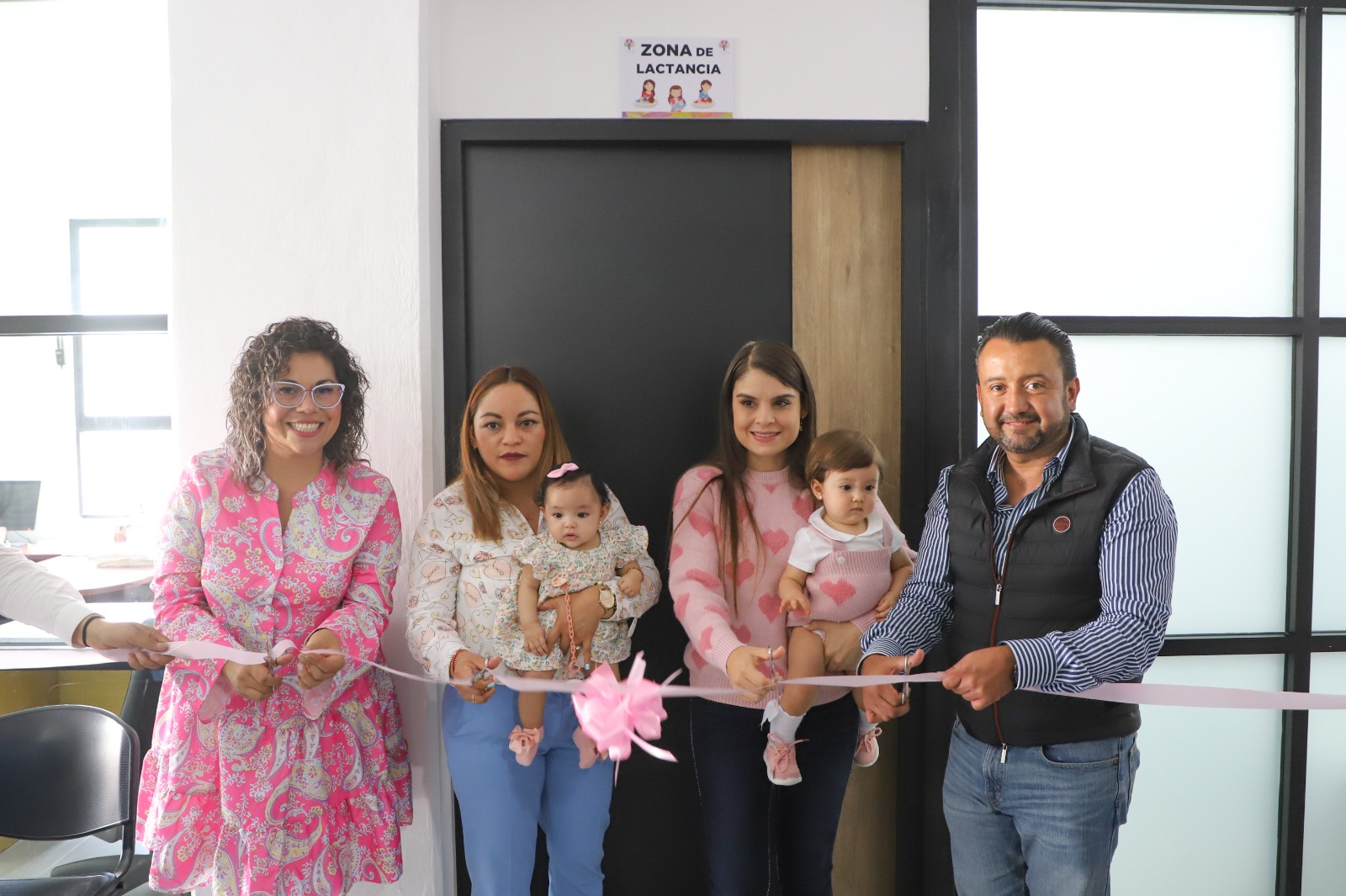 Una vez terminados los discursos de apertura por parte de ambos presidentes, se dieron a la tarea de acercarse a la sala de lactancia para poder cortar el listón de color rosa y así darse paso a esta habitación contando con la presencia de una maestra perteneciente a la platilla DIF, la cual sería la primera usuaria en esta sala.