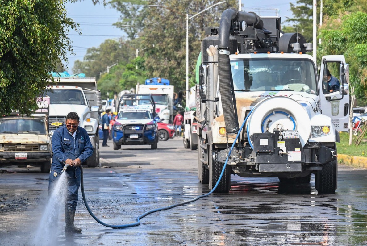 En las colonias que aún presentan encharcamientos se trabaja con cinco equipos de presión succión Vactor, seis camiones cisterna, un minicargador, un equipo especializado de 8 pulgadas y el de gran capacidad “Goliath”. Además, opera el cárcamo Vicente Villada y continúan los trabajos de desazolve de las redes de drenaje para retirar obstrucciones.