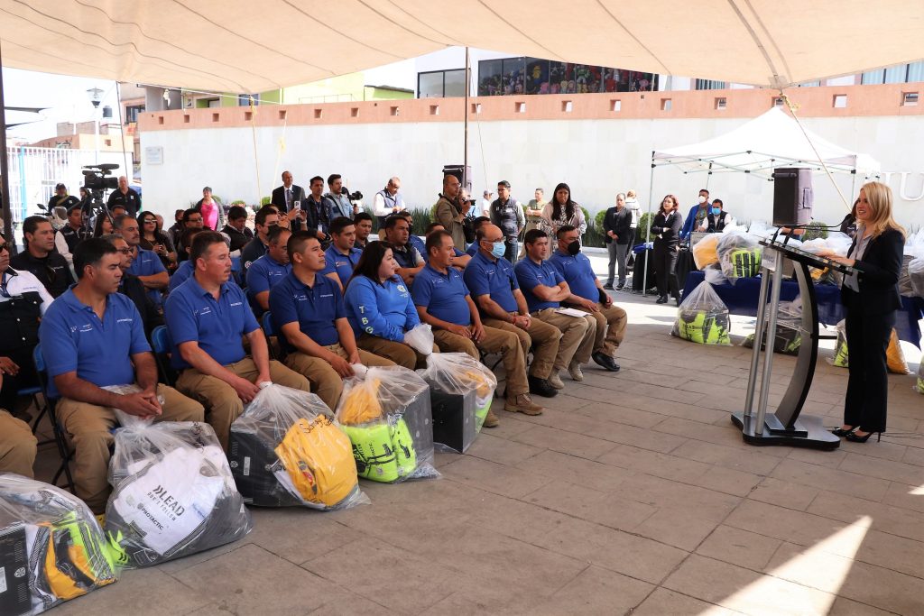 En compañía de integrantes del gabinete y del Cabildo, la alcaldesa entregó estos 70 uniformes, los cuales constan de botas, pantalones y cinturones tácticos, chamarras, camisola, playera e impermeables; equipamiento que permitirá atender todo tipo de emergencias, entre ellas, las que se presentan en temporada de lluvias, incendios forestales, entre otras.