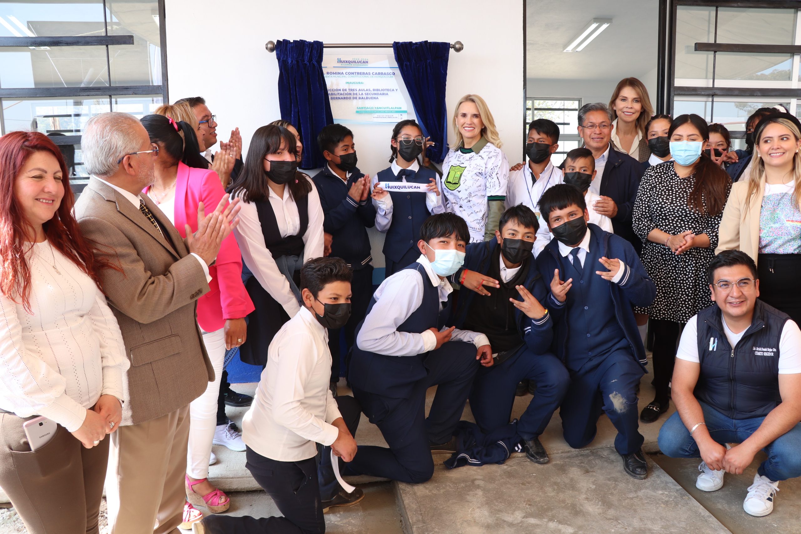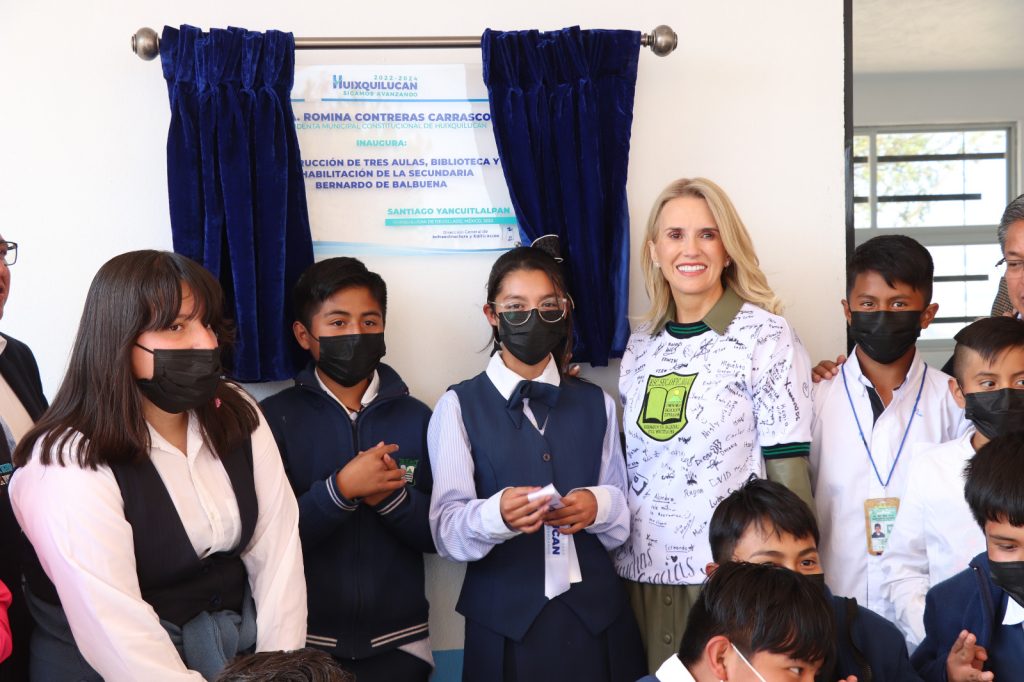 Durante su visita a esta comunidad, la presidenta municipal, Romina Contreras Carrasco, acudió a la secundaria “Bernardo Balbuena”, en donde entregó la construcción de tres nuevas aulas y una biblioteca, con una superficie de 262 metros cuadrados, además de realizar la rehabilitación integral del plantel.