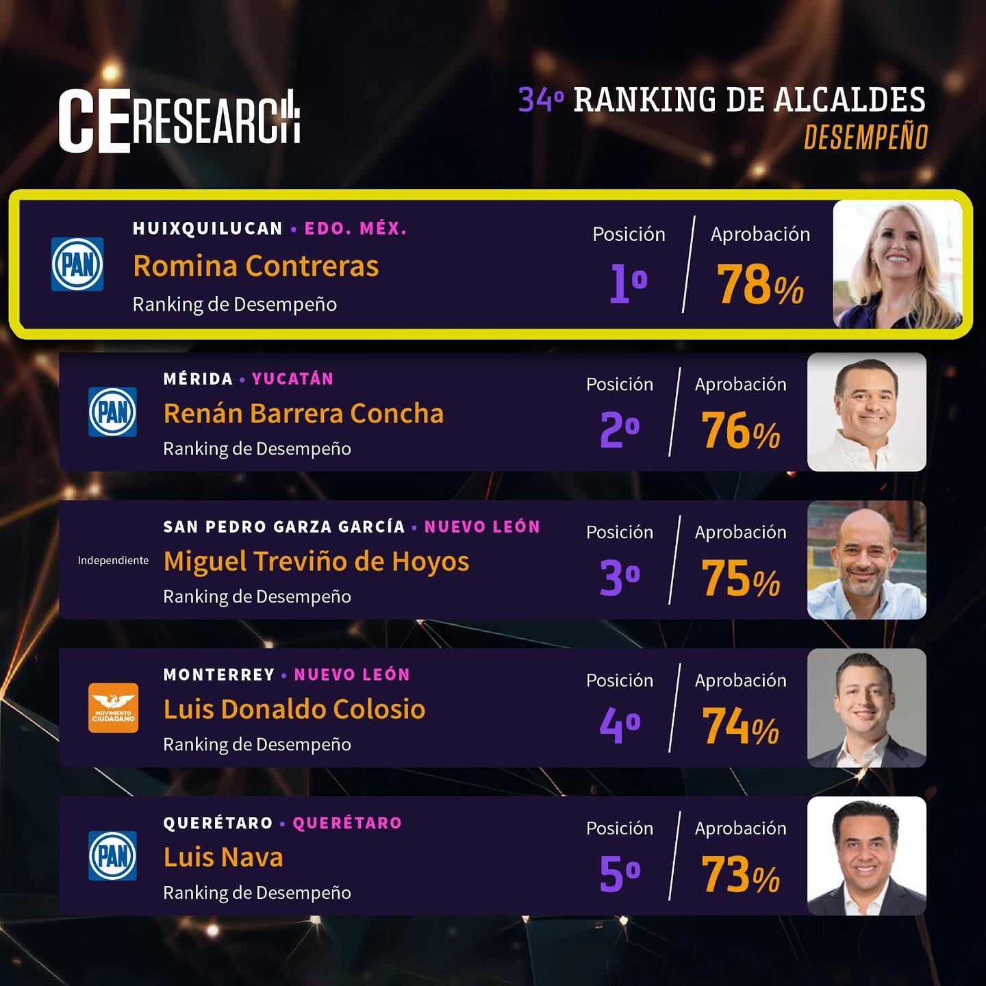En el 34 Ranking de Alcaldes de México, evaluación que C&E realiza de manera mensual, Romina Contreras obtuvo 78 por ciento de aprobación ciudadana, en cuanto al desempeño de su gestión, siendo así la puntuación más alta entre sus 60 homólogos de todo el país incluidos en esta medición.