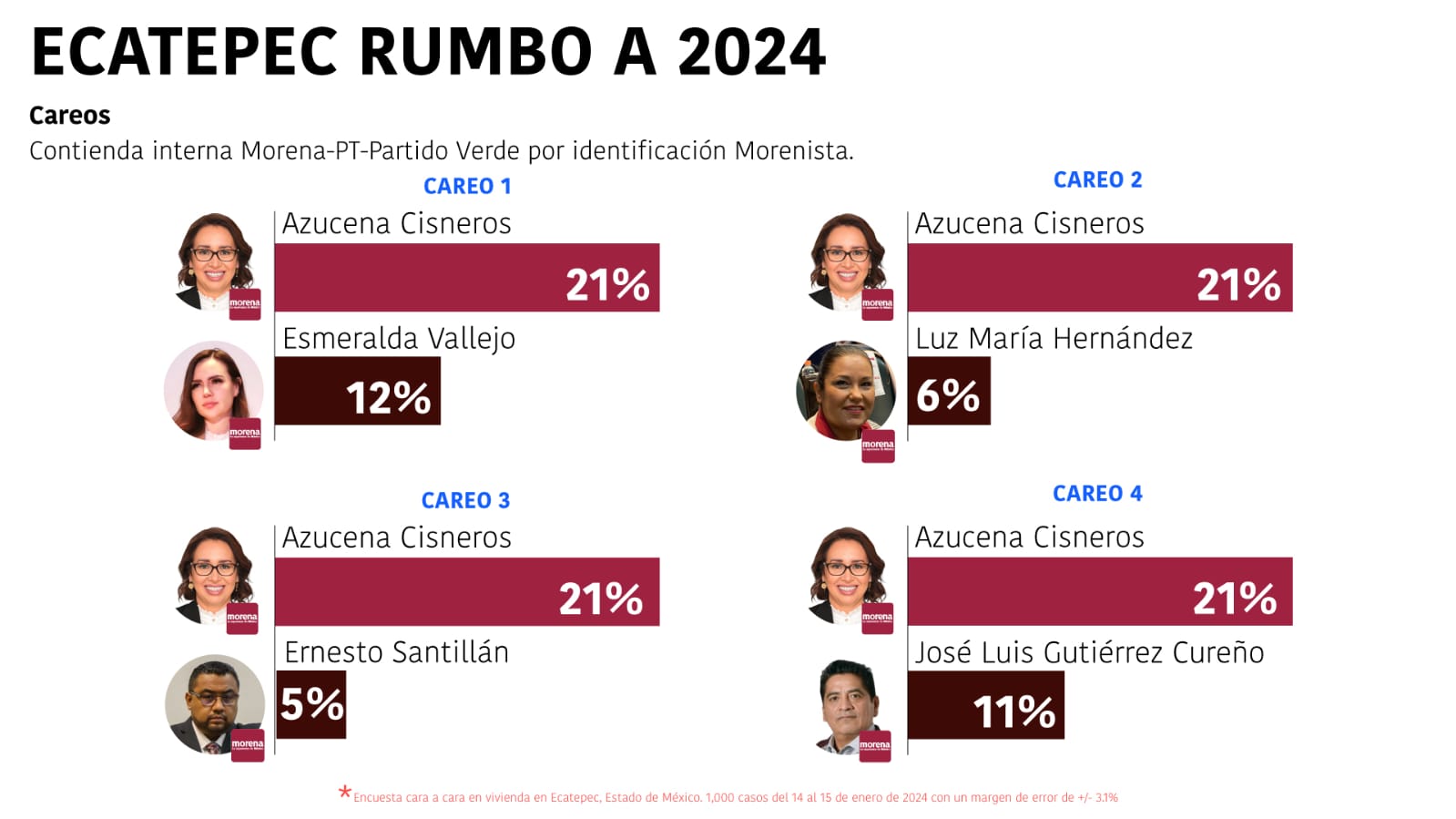 De acuerdo a la encuesta Ecatepec Rumbo a 2024, ya nadie le gana a la diputada Azucena Cisneros Coss, bajo la fórmula de selección como Coordinadora de los Comités de Defensa de la 4T en este municipio, con la mayor preferencia y atributos personales, con amplia ventaja al ser considerada buena candidata y la disposición a votar por ella; y en la intención del voto para presidente municipal por coalición, en alianza PVEM-Morena-PT duplica la preferencia frente al PAN-PRI-PRD.