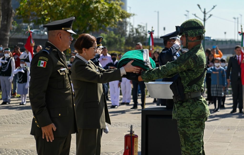 Detalló que el águila devorando una serpiente sobre un nopal es en alusión al pasado prehispánico, símbolo de la fundación de México-Tenochtitlán y un escudo que nos reitera la fortaleza y la victoria de nuestra nación.