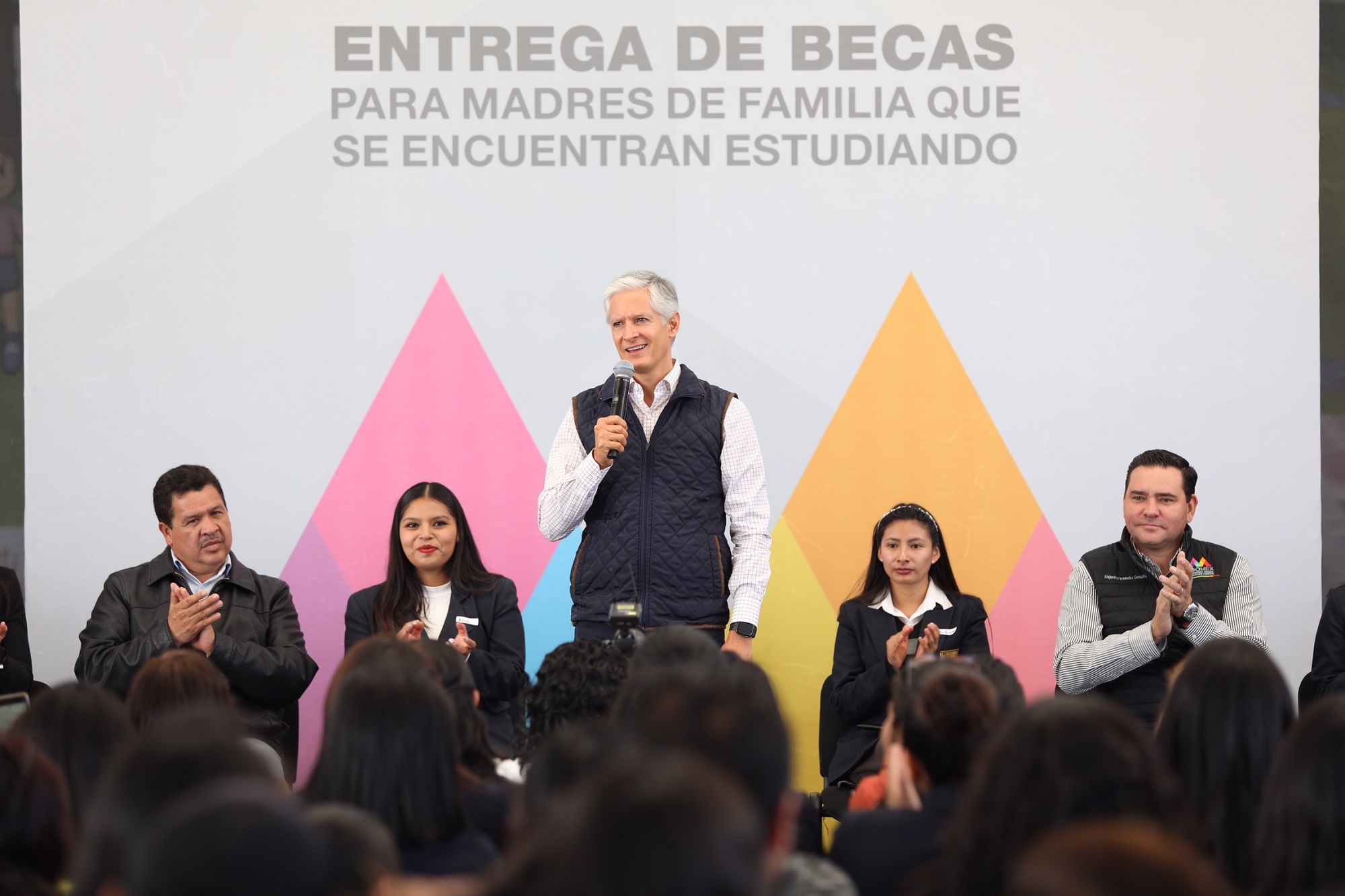 Zinacantepec, Estado de México, 10 de mayo de 2019. El Gobernador Alfredo Del Mazo Maza entregó becas para madres de familia jóvenes o mujeres embarazadas que se encuentran estudiando, programa que tiene como objetivo que no abandonen su preparación académica, a la vez que reiteró el compromiso de su administración para seguir apoyándolas y cumplan con la meta de terminar sus estudios.