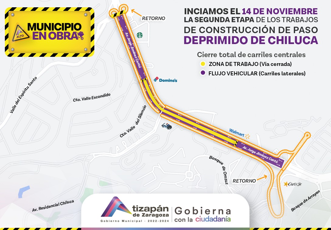 Debido a estos trabajos, los carriles centrales de la Avenida Dr. Jorge Jiménez Cantú, en el Fraccionamiento Chiluca, serán cerrados temporalmente a la circulación en un tramo de aproximadamente 550 metros de obras, desde el supermercado Walmart hasta la gasolinería.