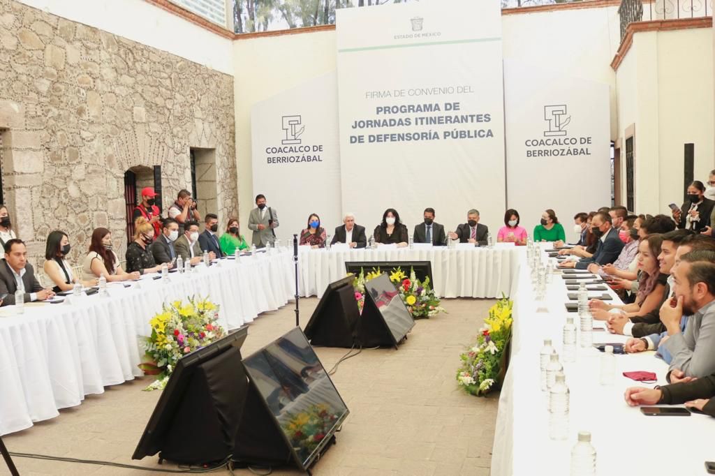 Con el propósito de acercar a los mexiquenses el acceso a la justicia, el Gobierno de Coacalco fue sede de la firma de convenio del “Programa de Jornadas Itinerantes de la Defensoría Pública”, mediante el cual brindarán asesorías jurídicas gratuitas en materia de defensa civil, familiar, mercantil, penal, así como defensoría juvenil y de mesa de responsabilidades para la población de 35 municipios de la Región Oriente del Valle de México.
