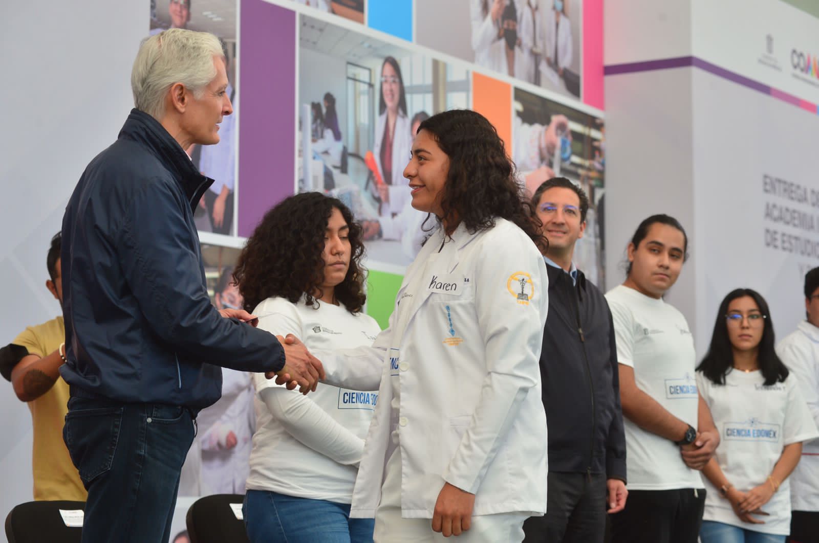 «Estamos fortaleciendo el apoyo para los jóvenes que se dedican a la ciencia, que se dedican a la investigación. En el Estado de México estamos convencidos de que debemos de apostarle, no nada más a la educación, sino a la ciencia y a la investigación, y por eso hemos impulsado este programa que se llama Becas Ciencia Edoméx.