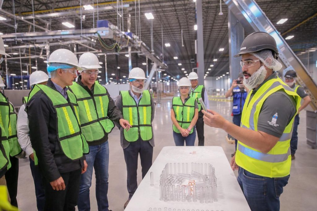 «Gracias a la confianza, a la inversión de más de 80 millones de dólares, aquí, en el Estado de México, hoy genera e impulsará, en los próximos días. porque además está a días de iniciar operaciones, la producción más rápida de botellas de agua del mundo, tendrá la línea de producción más rápida del mundo y esto le permitirá estar produciendo, por lo que nos platicaban hace un momento, 23 unidades por segundo, lo que equivale a cerca de 456 millones de botellas al año», subrayó.