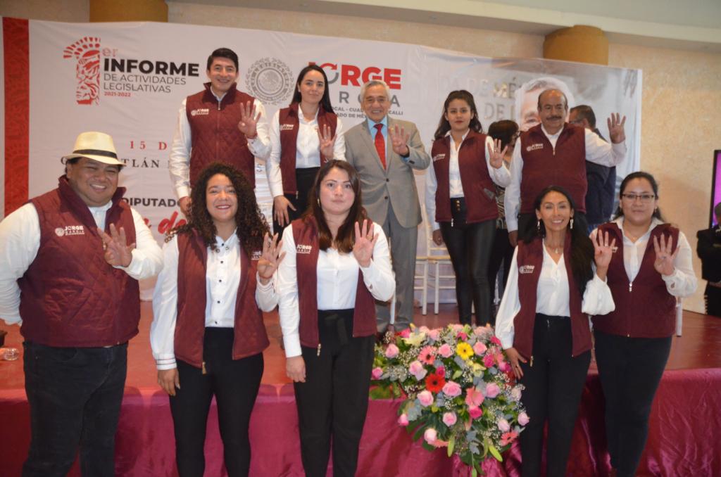 Durante su Primer Informe de Actividades Legislativas, el diputado local de Cuautitlán Izcalli por morena, Jorge García Sánchez, recibió el respaldo del también diputado Maurilio Hernández quien es el presidente de la Junta de Coordinación Política de la LXI Legislatura, reconoció el gran trabajo que ha venido realizando Jorge García a favor de las familias mexiquenses, al igual que el de las y los diputados locales morenistas con la transformación jurídica estatal y con el actual proyecto de país, lo cual se refleja en la aprobación de 90 dictámenes mismos que favorecen el estado de derecho y el bienestar social de todos los mexiquenses.