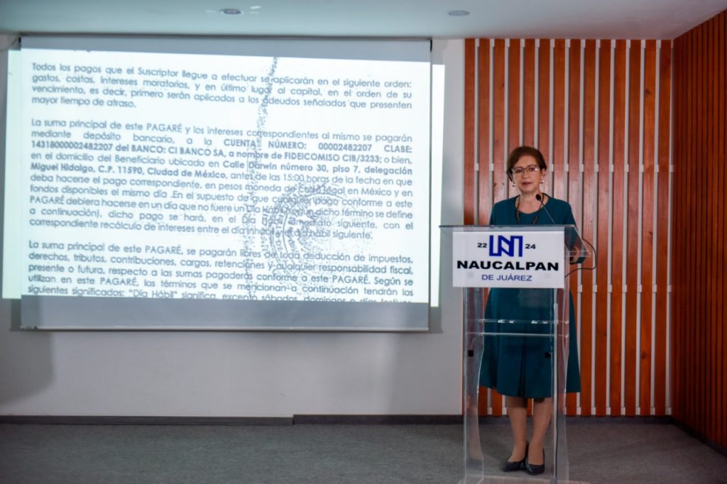 Angélica Moya Marín, presidenta municipal de Naucalpan, aseguró en conferencia de prensa que el incumplimiento de las obligaciones que dieron origen al pagaré generó el embargo de recursos del Fondo de Aportaciones para la Infraestructura Social Municipal y de las Demarcaciones Territoriales del Distrito Federal 2022 (FISMDF), que se destina a los municipios para aplicarlos en obra pública en zonas de pobreza extrema y alto nivel de rezago social.