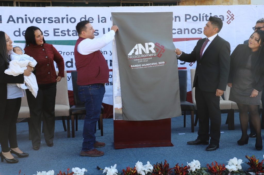 NICOLÁS ROMERO.- El Presidente Municipal, Armando Navarrete, promulgó el Bando Municipal 2019. La ceremonia cívica se realizó en la explanada municipal, donde el Edil, acompañado de su Cabildo, destacó los principales temas que se adicionaron a este documento.